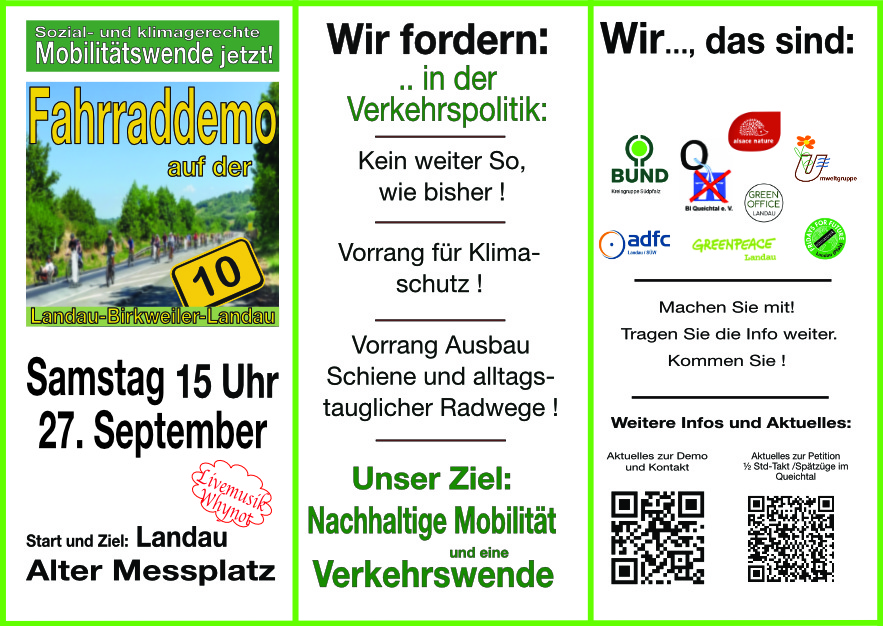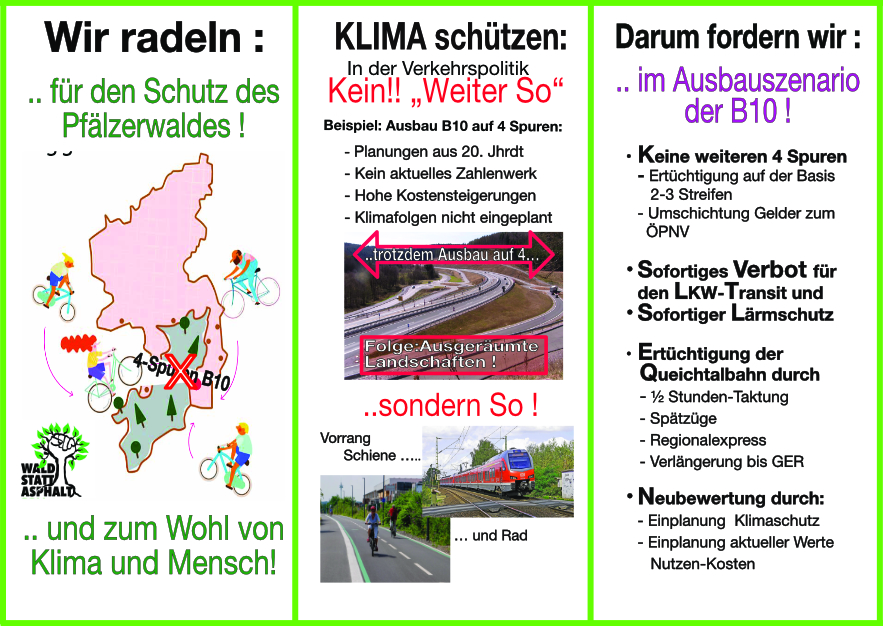 Wir setzen uns ein für eine sozial- und klimagerechte Mobilitätswende. Der Verkehrssektor muss seinen Beitrag zum Klimaschutz endlich erfüllen. Ein "Weiter So, wie bisher" geht nicht mehr! Dies wird an dem aus unserer Sicht unsinnigen Jahrhundertprojekt 4-spuriger Ausbau B 10 zwischen Pirmasens und Landau mitten durch das international ausgezeichnete Biosphärenreservat Pfälzerwald-Nordvogesen deutlich - deshalb radeln wir symbolisch auf der B10.