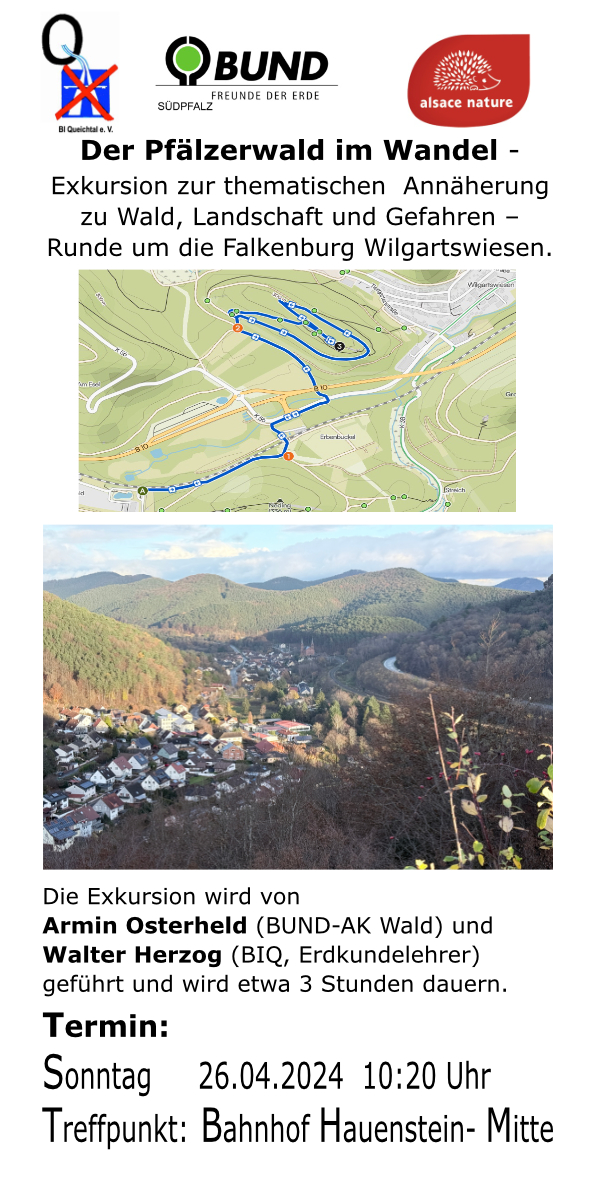 Aus diesen Gründen rufen wir zum Schutze des Pfälzerwaldes, zum Wohle der Menschen und zum Schutze des Klimas zu einer Demonstration für den Donnerstag 13. April gegen 14 Uhr am Hohenstaufensaal in Annweiler auf.
